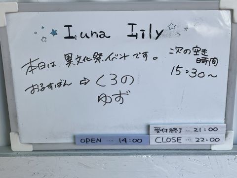 営業時間 平 日 15:00〜22:00 土日祝 14:00〜22:00 または 13:00~21:00 (21時または20時受付終了)